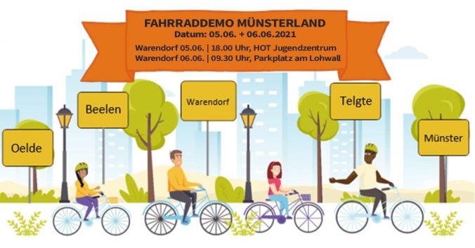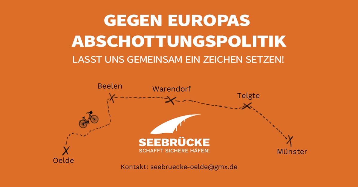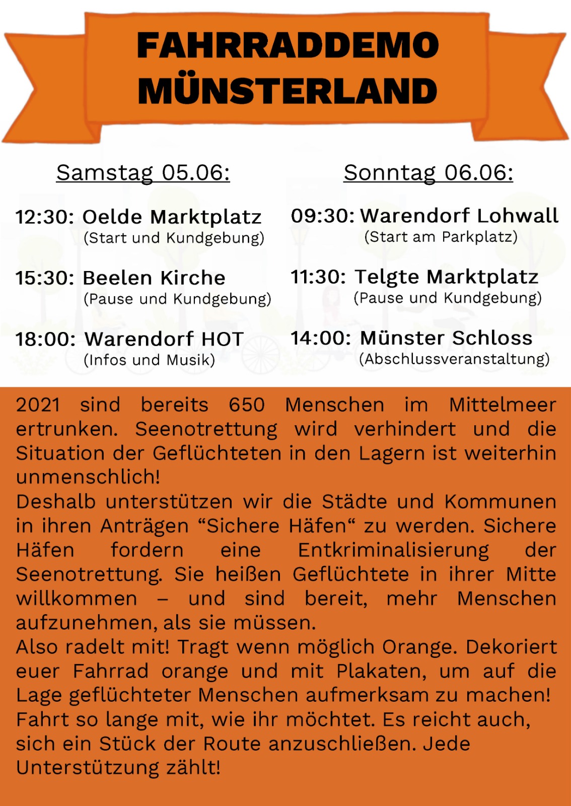 Am ersten Juni-Wochenende wird im gesamten Münsterland und Osnabrück eine Fahrraddemo unter dem Motto „Ziel: Sicherer Hafen Münsterland! Brücken bauen! Hafen werden! Leben retten!“ stattfinden.